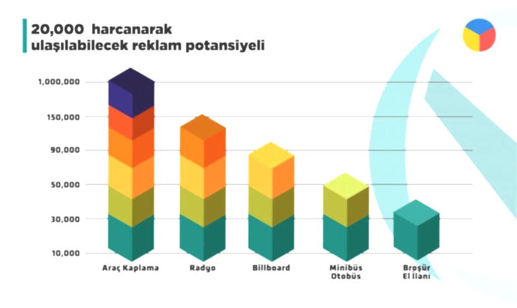Yukarıdaki grafikte de belirttiğimiz üzere 2,000 tl gibi bir rakam harcanarak yapılabilecek reklam potansiyelinde en yüksek rağbet, dönüşüm alabileceğiniz reklam ve tanıtım alanı araç kaplama işlemi ile gerçekleşmektedir.